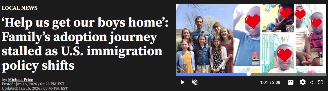 This is a case where the local “news” didn’t have to go far. A local family is trying to adopt 3 Haitian boys and are having trouble because of the suspension of visas from Haiti. This is leading to a delay in their adoption of these Haitians and that of course is great fodder for a sob story.