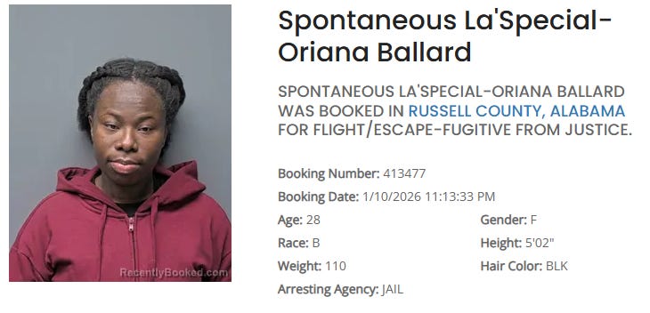 It looks like she done runned off ahead of the law outta Texas but was nabbed in Alabama because just 12 days later she was booked in Tarrant County, Texas (Fort Worth area) with her ‘do undid…