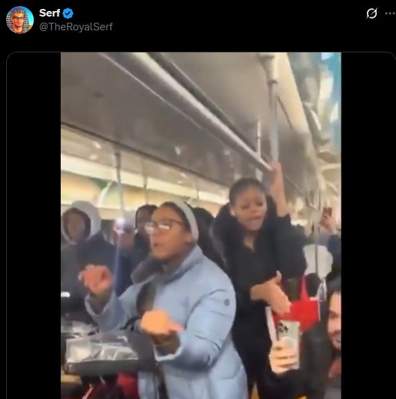 Of course it is like half a dozen sheboons harassing a lone White girl because they love it when they can act this way without consequences. If she had engaged them they would have attacked her and beaten her half (or all the way) to death. So she just sits there and takes it while the smug subhumans mock her until she gets off the train and then says the magic word.
