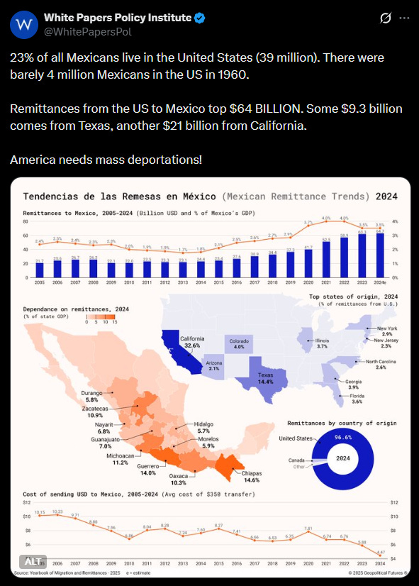 23% of all living people born in Mexico live in the US, approximately 39 million of them. The $65 billion in remittances they send home is 3+% of Mexico’s GDP and a major source of foreign currency reserves.