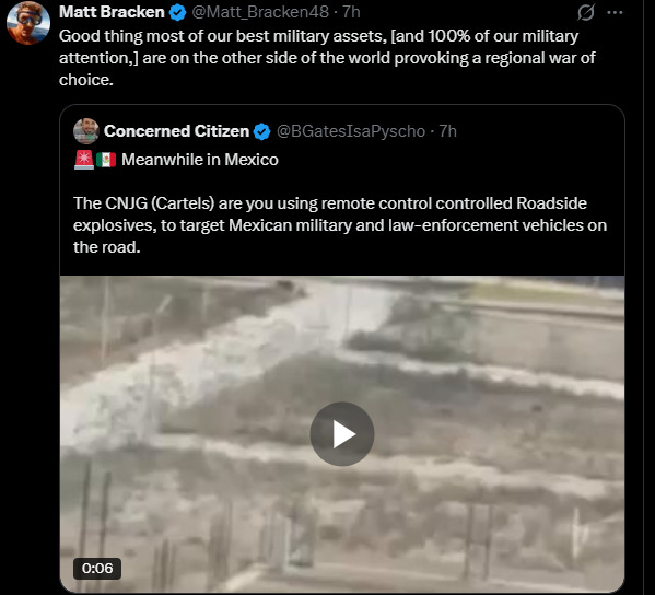 Watch the videos on Twitter coming out of Mexico, especially the one with burning cars in the parking lot of a Costco. That is what the future quite likely looks like in America in the very near future. Maybe Trump should prioritize the issue on our southern border instead of Iran?