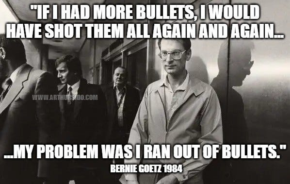 Goetz walked in 84, today in NY or Chicago, they would bury him under the jail. In Texas, you’d get a holiday named after you for capping this guy. We aren’t coming back from this point in our history without incredible carnage. I mean animals copulating by force in public? What even is that?