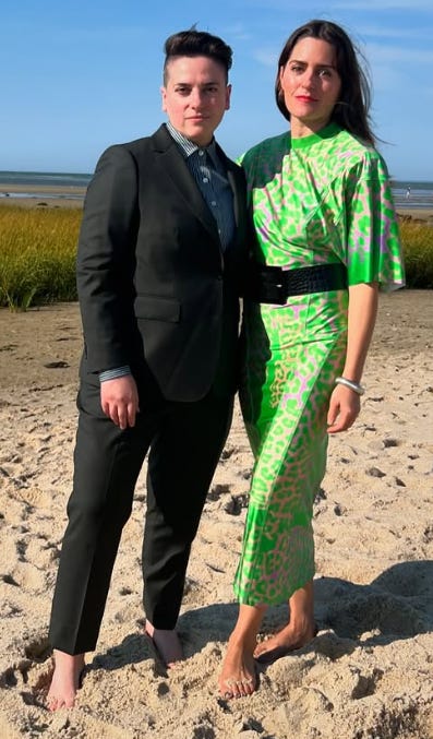In a shocking twist that no one could have seen coming, she is a dyke and manages to work that into the story by the 5th word by mentioning her “wife”. Here is the lovely couple: