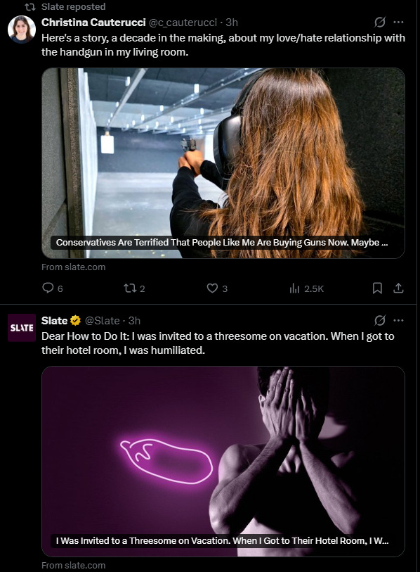 This is supposed to be a serious journalist writing a totally serious article. That aura is further diminished when Slate retweeted her story right above a story about a humiliating threesome experience….