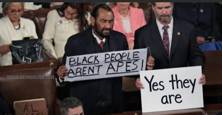 Just a shitshow and I wasn’t having it. The only moment of levity was the Geico Caveman, Representative Al Green of Texas, being tossed out for holding up a sign that read: “black people aren’t apes!”, which of course was immediate fodder for meme shenanigans.