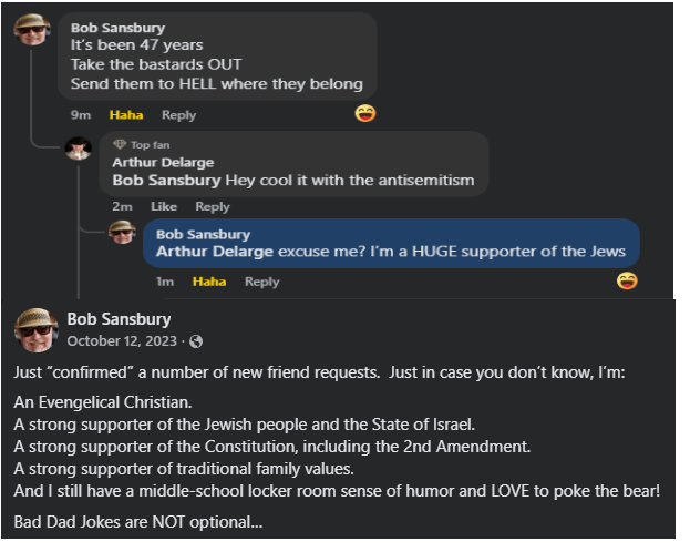 Bob is an “evengelical” Christian and I am sure he doesn’t know that is spelled incorrectly and he thinks that means he has to be a HUGE supporter of the Jews. Apparently what Jesus really wants is to see two groups of unbelievers killing each other. I am pretty sure that is right there in the New Testament somewhere. I bet Bob will be sitting in a pew tomorrow morning praying for the death of Iranians. I would also bet that Bob’s “friends” list is full of sockpuppet accounts with profile pics of girls with huge tits that are single and looking for friends.
