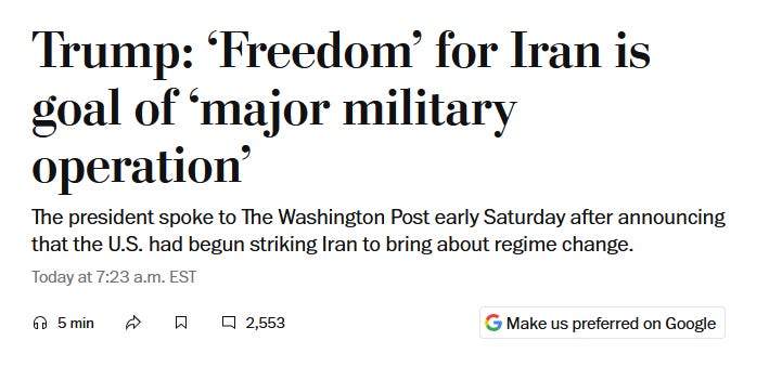 We have been hearing the “weeks/days/seconds away from obtaining nukes” for weeks but that went away. In his remarks, Trump switched completely away from talk about nukes and has gone all in on regime change, something we were told he did not support. Notice he spoke directly with the official party organ of the Deep State, the Washington Post. I guess the fake news lying media is OK when he is explaining why he is doing Israel’s bidding.