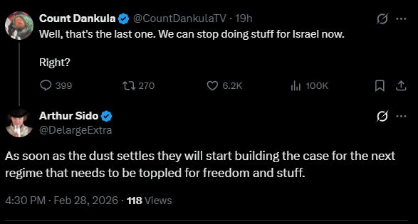 I said it on Saturday when the attacks kicked off. Once the dust settles they will start making the case for the next “existential threat” to Israel.