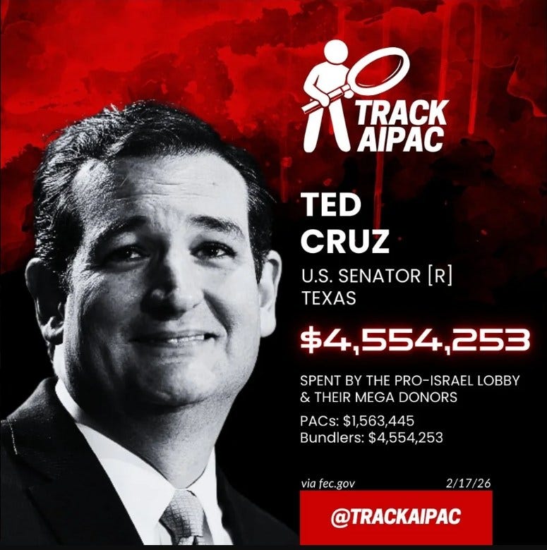 ![May be an image of text that says 'ኢቀና TRACK AIPAC TED CRUZ U.S. SENATOR [R] TEXAS $4,554,253 $4, 554 ,253 SPENT BY THE PRO- ISRAEL LOBBY & THEIR &THEIRMEGADONORS MEGA DONORS PACs: $1,563 $1,563,445 445 Bundlers: $4,554,253 via fec. fec.gov σον 2/17/26 @TRACKAIPAC' May be an image of text that says 'ኢቀና TRACK AIPAC TED CRUZ U.S. SENATOR [R] TEXAS $4,554,253 $4, 554 ,253 SPENT BY THE PRO- ISRAEL LOBBY & THEIR &THEIRMEGADONORS MEGA DONORS PACs: $1,563 $1,563,445 445 Bundlers: $4,554,253 via fec. fec.gov σον 2/17/26 @TRACKAIPAC'](https://substackcdn.com/image/fetch/$s_!u-HD!,w_1456,c_limit,f_auto,q_auto:good,fl_progressive:steep/https%3A%2F%2Fsubstack-post-media.s3.amazonaws.com%2Fpublic%2Fimages%2F455af180-366f-4bb3-9b33-e35ebf3377a1_775x780.jpeg)