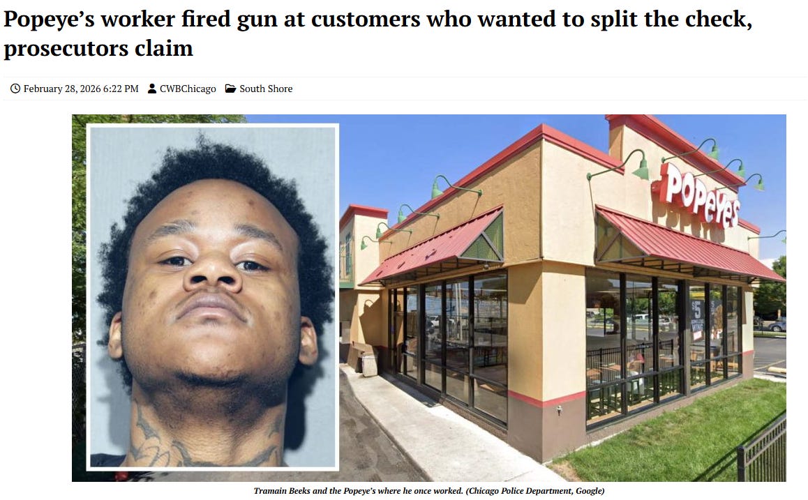 South Shore is listed as 92% black and given this was at a Popeyes this is almost certainly 2G-on-2G violence. I am sure the people in the car were polite and respectful when asking for their orders to be rung up separately.
