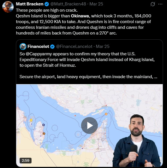 Really it feels to me like the situation is at kind of an impasse, with the US unable to do anything to decisively end Iran’s continued missile attacks, and that Trump is about to commit a tactical faux pas by putting ground troops in the mix. Further escalation by the US looks like it will cause Iran to lash out even more, and they still retain plenty of offensive capability ‘