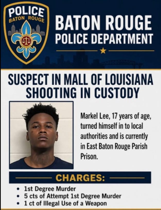 According to the chief, Markel Lee, 17, is facing charges for first-degree murder, five counts of attempted first-degree murder, and one count of illegal use of a weapon. He turned himself in and was booked into the East Baton Rouge Parish Prison.